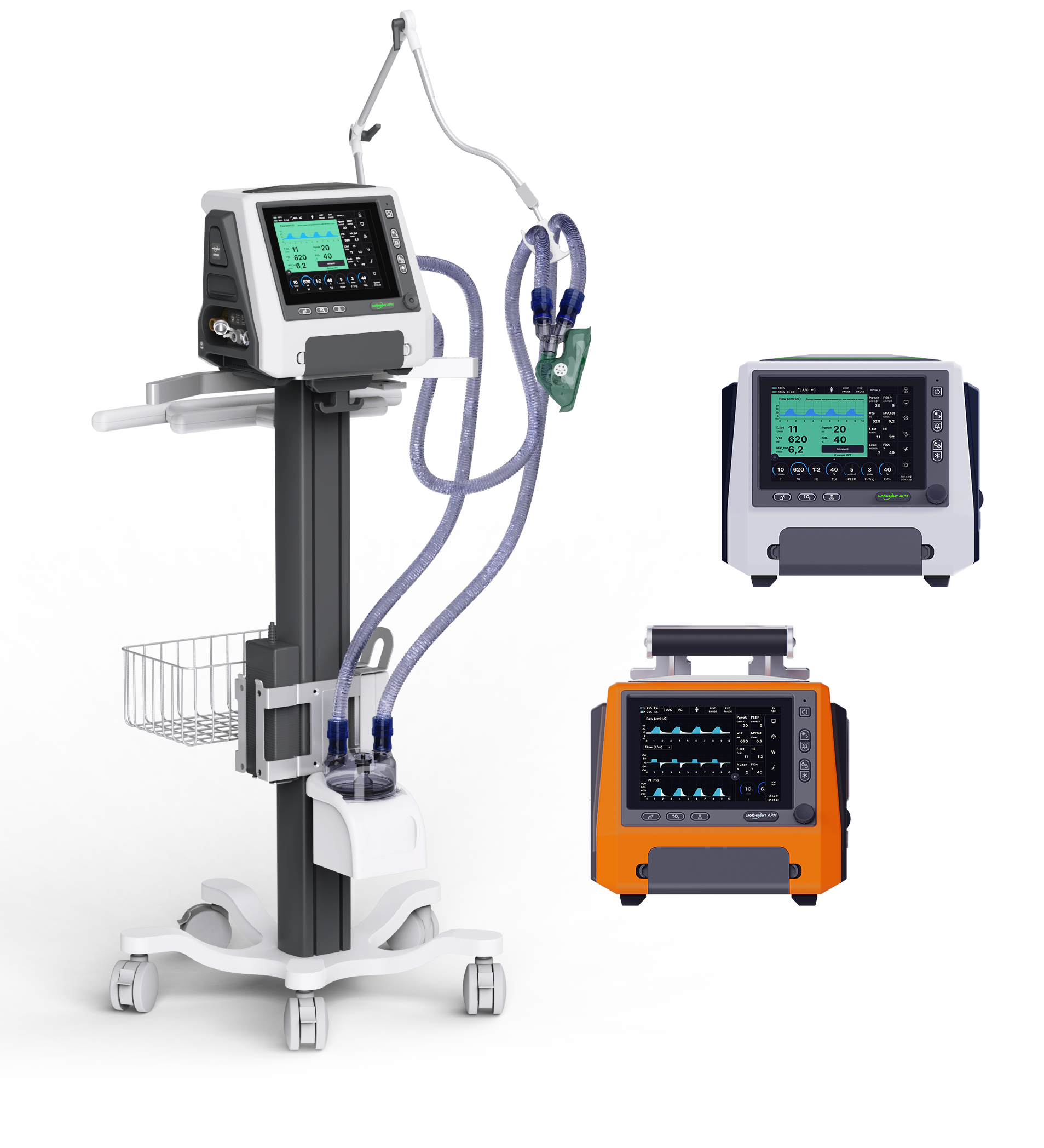 Область применения исполнения АИВЛ «Мобивент АРМ-М»: интенсивная терапия взрослых и педиатрических пациентов в условиях операционных, отделений реанимации и интенсивной терапии, при транспортировке внутри медицинских учреждений, а также в отделениях магниторезонансной томографии.